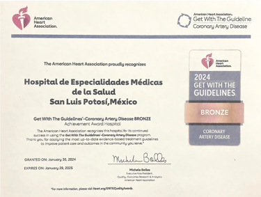 Entre los 4,352 hospitales en México, Gissa ha sido galardonado con el reconocimiento Bronce por la American Heart Association, por su desempeño en el manejo de pacientes con síndromes coronarios agudos.
